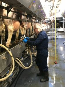 Er wordt goed gezorgd voor de koeien die met de hand aan de melkmachine gezet worden. “Geen melkrobot voor deze boer, dan verlies je alle contact met je dieren” aldus de jonge boer. Zorgvuldig worden alle uiers ingesmeerd met een beschermende zalf. Als de dieren een voor een de machine in lopen blijkt dat ze er “ook wel aan toe zijn” om gemolken te worden gezien de druppels melk die al aan de uiers hangen. Zelf mocht ik bij een paar dieren de zuigers aan de uiers doen.