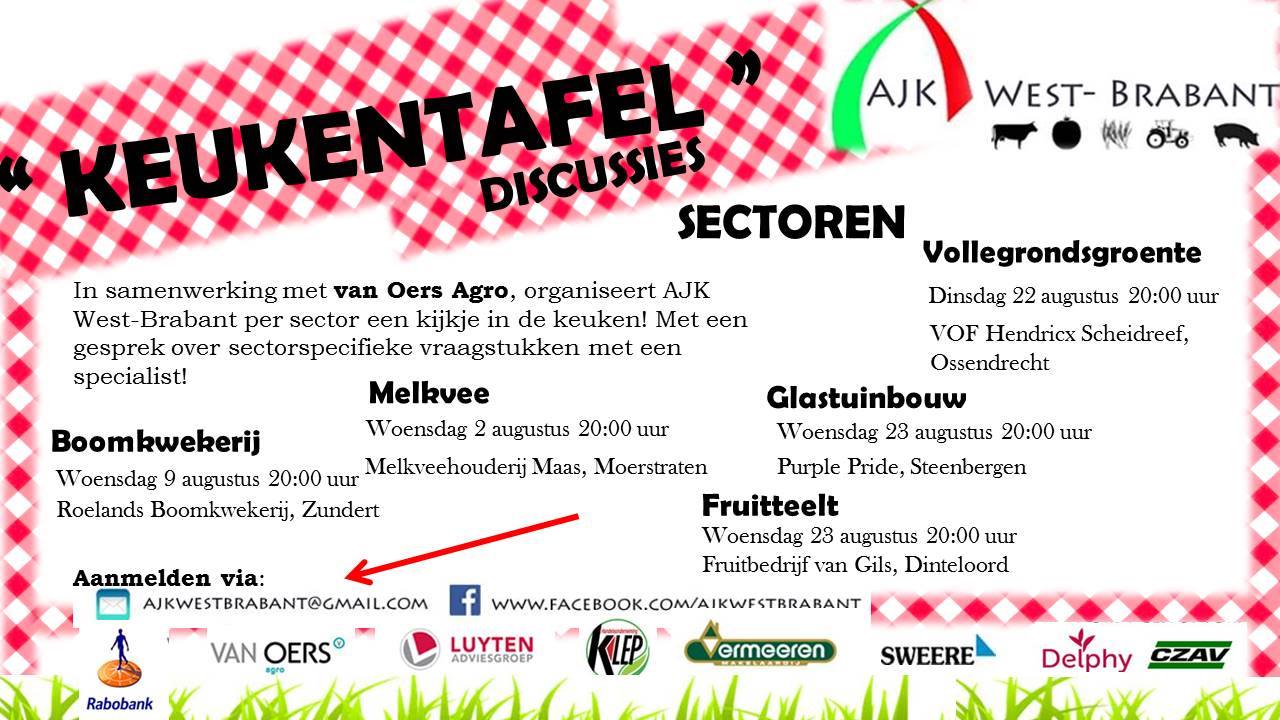 In samenwerking met van Oers Agro zijn er de ‘Keukentafel discussies’! Per sector een bijeenkomst met rondleiding op het bedrijf en een discussie achteraf aan de hand van een sector specialist die jullie meeneemt in de ‘diepte’! Hier wil je bij zijn! Sectoren met data en tijden worden via de mail bekend gemaakt. Aanmelden kan vanaf nu via ajk.westbrabant@gmail.com of via een AJK West-Brabant bestuurder. Je aanmelding wordt bevestigd, want vol = vol!