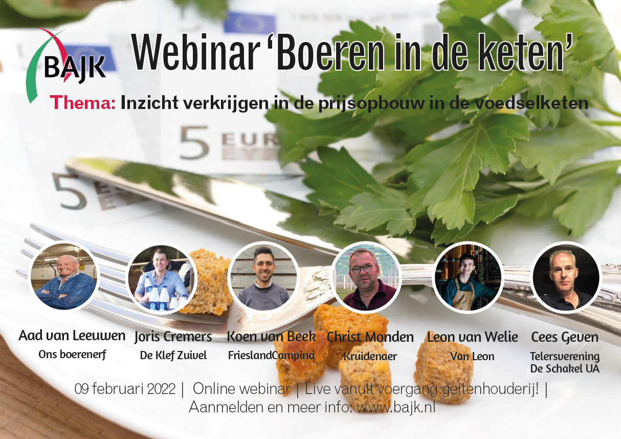 Beste (B)AJK’er, We zijn als jonge boeren en tuinders allemaal onderdeel van een keten. In dit project willen we meer inzicht geven in de prijsopbouw in verschillende ketens. We willen jullie uitnodigen om op woensdag 9 februari 2022 om online aan te sluiten bij het webinar. In dit webinar komen er verschillende sprekers uit plantaardige […]