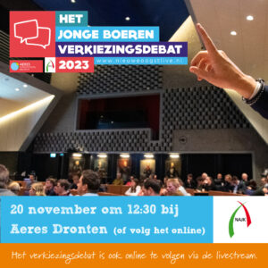 Op maandag 20 november organiseert NAJK, samen met Aeres Hogeschool en Nieuwe Oogst het Jonge Boeren Verkiezingsdebat 2023. In het debat staat de toekomst van de agrarische sector en de positie van jonge agrariërs centraal. Lees meer.