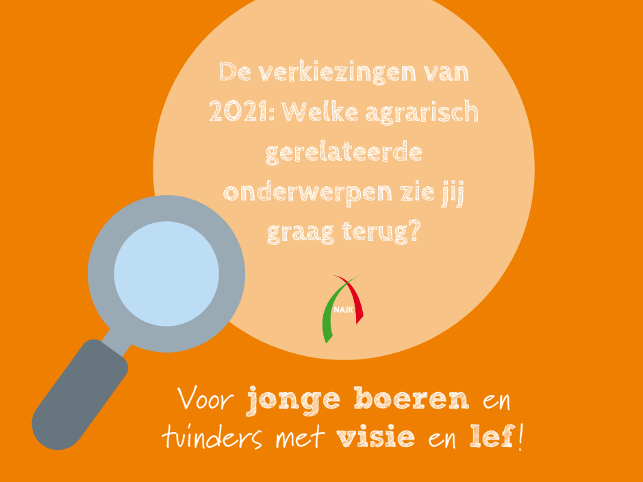 Het lijkt nog een eeuwigheid te duren, maar de politieke partijen zijn al weer druk bezig met de invulling van de partijprogramma’s voor de Tweede Kamerverkiezing van 2021. Help een handje mee en laat NAJK weten welke agrarisch gerelateerde onderwerpen jij graag terug ziet in het partijprogramma. Dit kan geheel anoniem via dit formulier.
